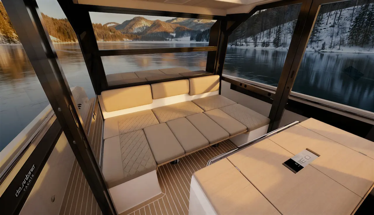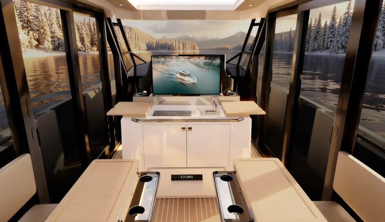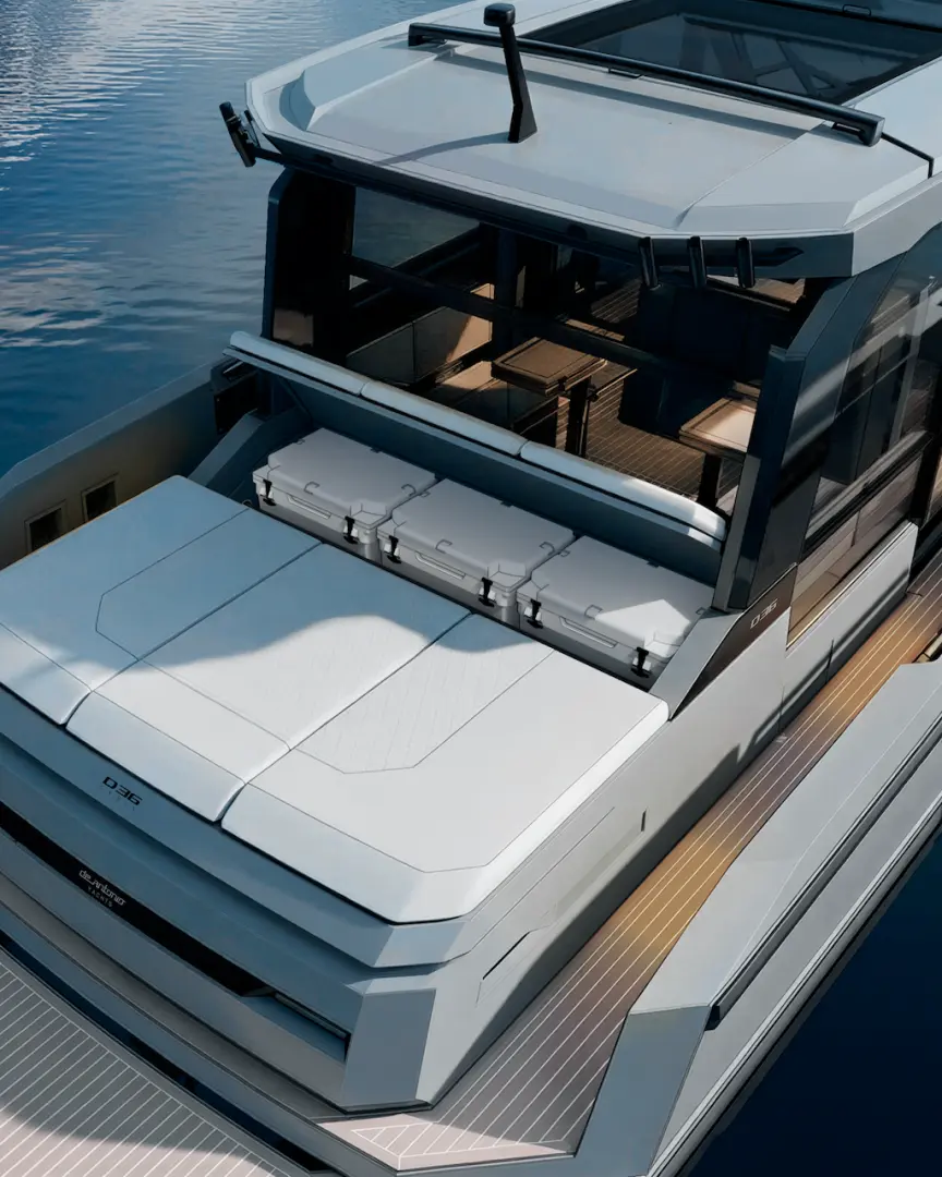 Çevresini saran cam yüzeyler, sürgülü yan kapılar, akordeon tip arka açılım ve üstten açılabilir sert tavan yapısı sayesinde D36 Cabin, kapalı alan konforu ile açık deniz keyfi arasında dengeli bir kullanım sunar.