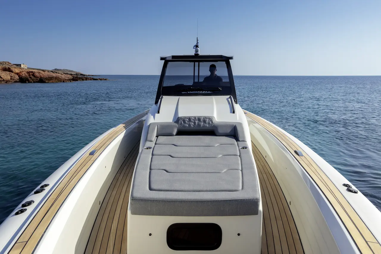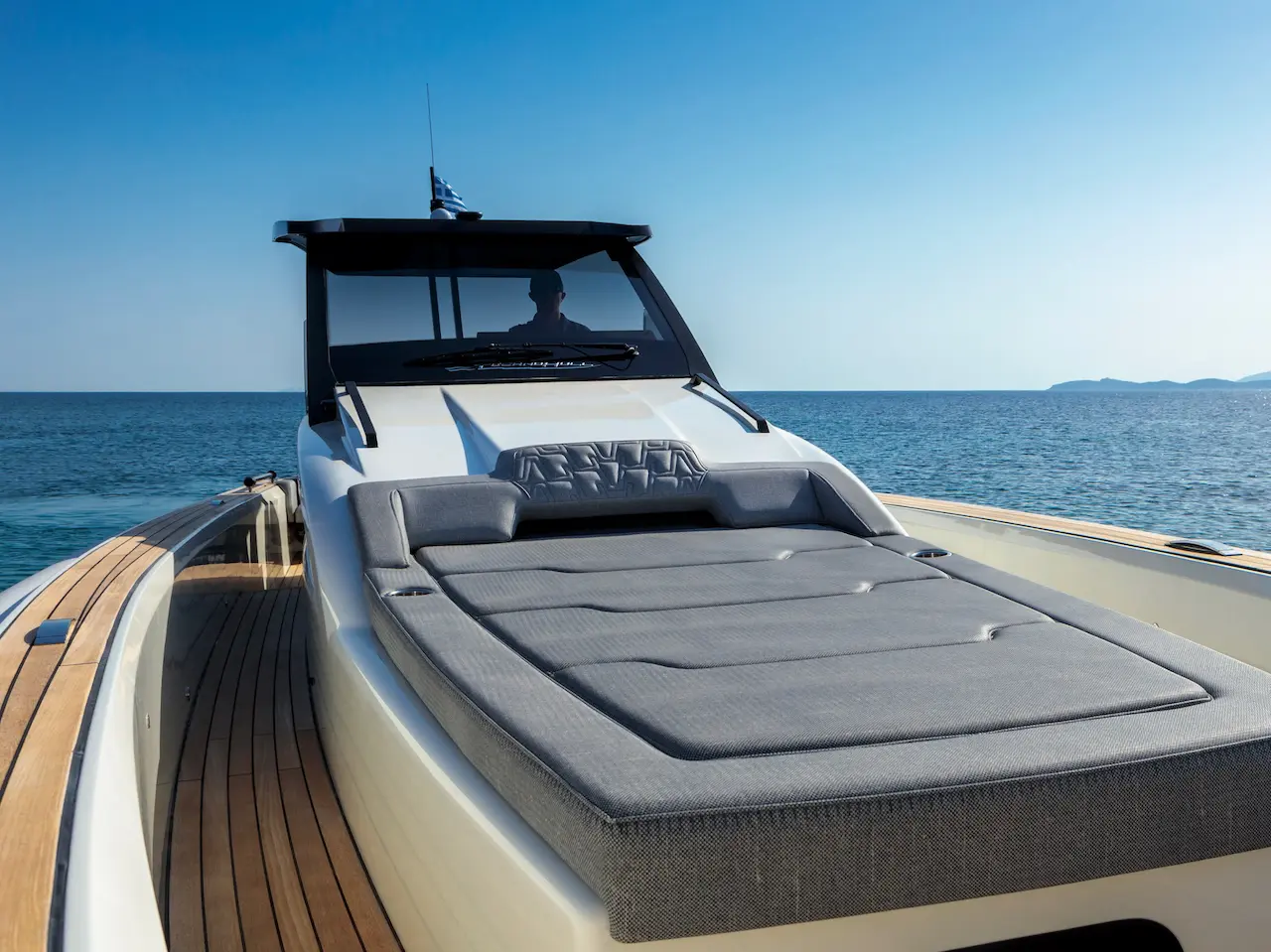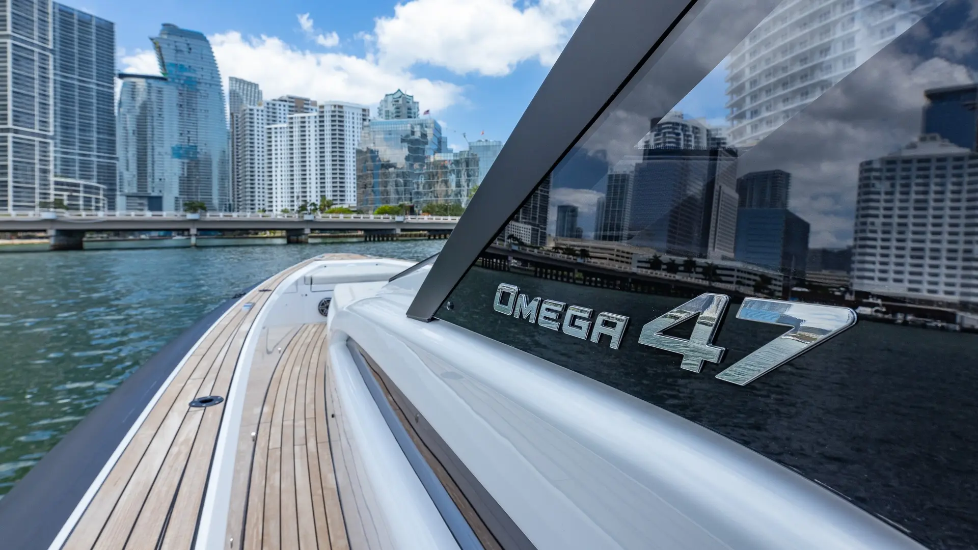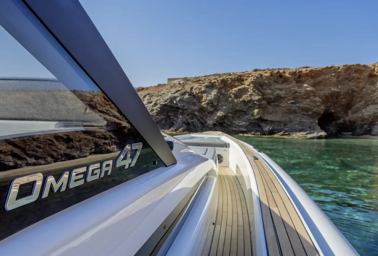 Omega 47, teak kaplama güverte, gelişmiş ses sistemleri, ambient aydınlatmalar ve yüksek kaliteli ekipmanları ile premium bir deneyim sunar. Wet bar, geniş depolama alanları ve çok yönlü donanım seçenekleri ile hem performans hem yaşam konforu üst seviyeye taşınır.