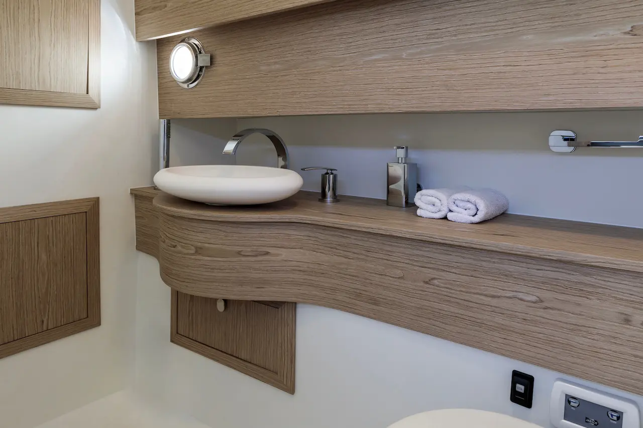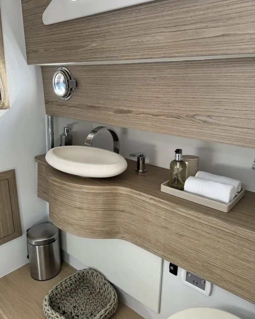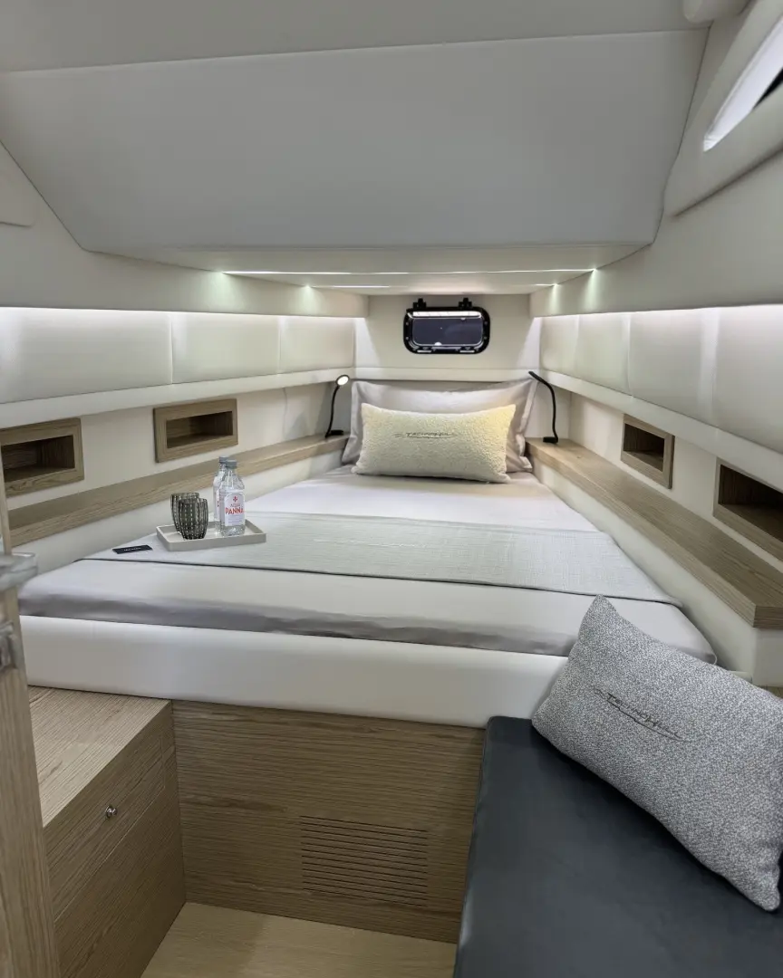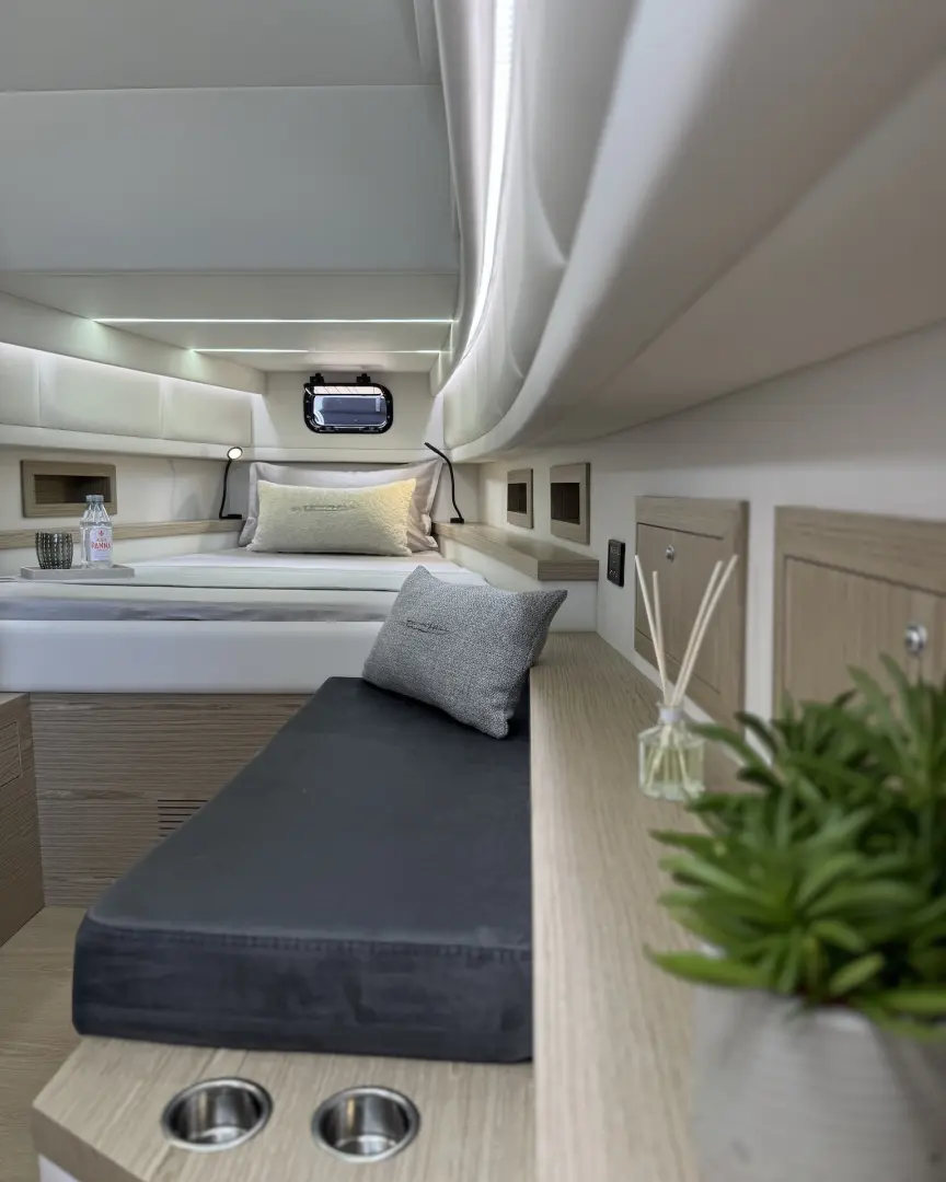 Omega 47’nin kabini, yat standartlarında konfor sunacak şekilde tasarlanmıştır. Geniş çift kişilik yatak, tam boy duş ve tuvalet alanı, depolama çözümleri ve premium malzeme kullanımı ile konforlu bir konaklama imkanı sağlar. Doğal ışık ve kaliteli iç mekan detayları, ferah ve lüks bir atmosfer oluşturur.